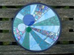 Ann asked me to make this outdoor sunflower which she wanted to give as a present for her friend Lesley to hang in her newly restored garden in Cheltenham. As it was for outside I used Mexican and Irridescent tiles with slithers of red glass and mirror, which will give it a lovely shine when the light catches it.