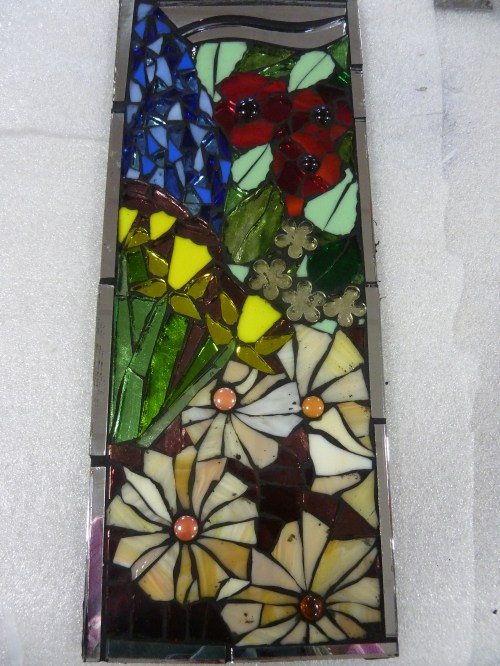 Although I know it is a very basic version of what Jane was trying to teach us, it has given me a good start and has enabled me to grasp the basics of cutting and shaping the glass. It seems to be a very, very messy process and no matter how neat you try to be, you get tiny shards of glass everywhere so I am forever tidying up after myself. The ‘rule’ of never going into my studio barefoot is even more relevant with glass bits hiding everywhere. I really enjoy making these glass pieces, I love the long ‘slashes’ of glass and the dramatic effect they create. I will now need to perfect cutting the smaller pieces and shapes to make up the pictures.